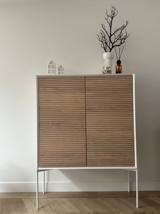 This stylish cabinet has white sides and two ribbed ash veneer doors, with white steel legs.