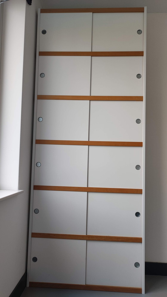 High bookcase by Kewlox in white, in good condition. The cabinet has 12 sliding panels, silver metal knobs and wooden back panel. Can be picked up disassembled.