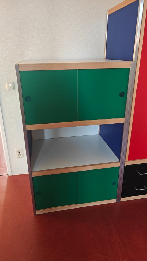 Kewlox wardrobe with three compartments at the top and bottom, featuring green sliding doors. The center compartment is open.