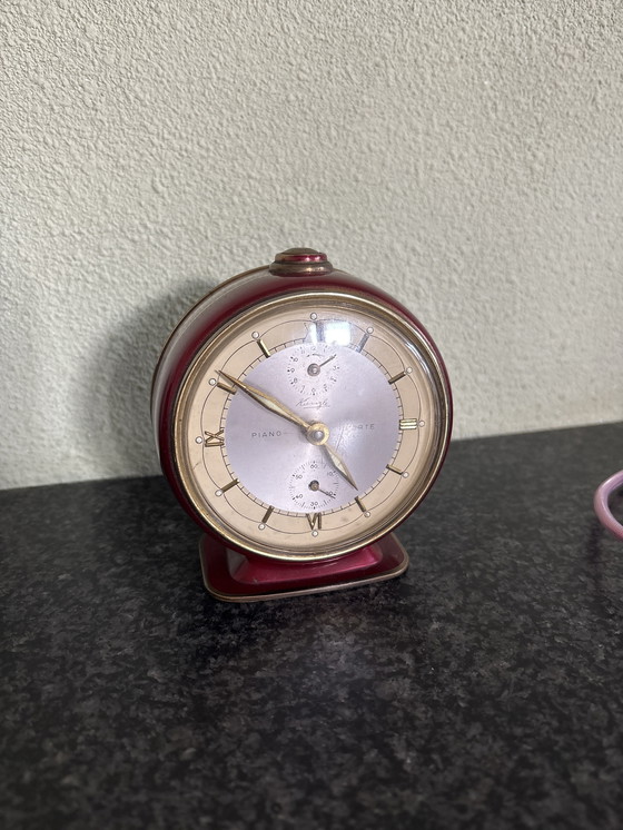 Step back in time with this exquisite Kienzle Piano Forte vintage alarm clock, a true testament to classic design and craftsmanship. Its rich red hue, complemented by elegant gold accents, makes it a striking addition to any room, evoking a sense of nostalgia and timeless elegance.