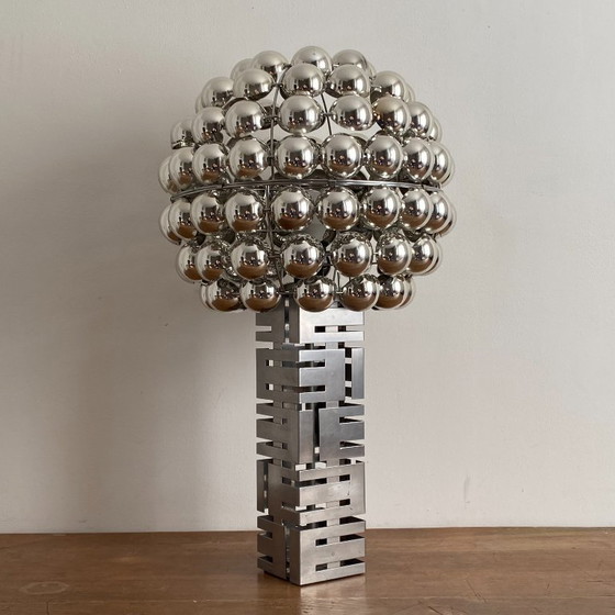 Large vintage living room lamp in the shape of a skyscraper. 1970s. Sculptural BUILDING base in chromed steel by Curtis Jéré, dating from the 1970s. Paired with a KARE lampshade. Removable silver plastic hemispheres.