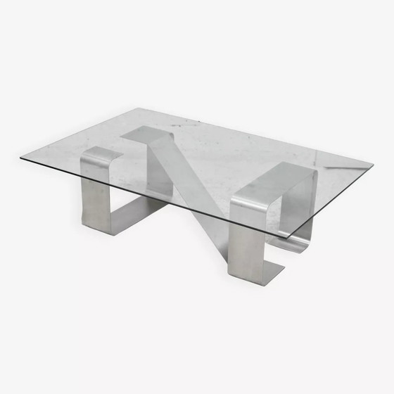 Coffee table with "kinetic" steel legs and glass slab. In the style of François Monnet for Kappa or Paul Legeard for Dom. Circa 1970. Steel base, numerous visible steel scratches (normal given age). See photos. Solid construction. Glass slab (non-safety) on top. Design in the style of François Monnet Kappa or Paul Legeard.