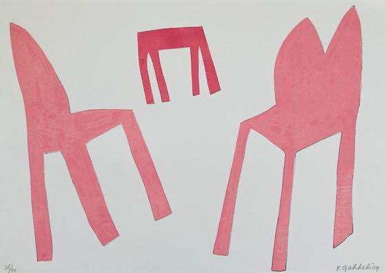 A beautiful large pink woodblock print by Dutch artist Klaas Gubbels. The print is hand-signed and has a run number of 36/40. The print can be framed like this and hung in a design interior.