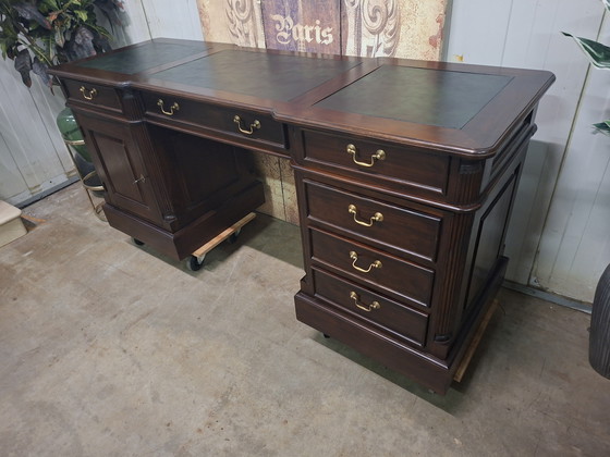 Ontdek de tijdloze elegantie van dit klassieke Engelse bureau, een meesterwerk van vakmanschap dat zowel stijl als functionaliteit biedt. Dit unieke, smalle model is perfect voor wie op zoek is naar een verfijnde toevoeging aan hun kantoor of studeerkamer. De lederen inleg geeft het bureau een luxueuze uitstraling, terwijl de rijke houttinten een warme sfeer creëren. Met zijn royale afmetingen van 180 cm breed, 60 cm diep en 80 cm hoog, biedt dit bureau voldoende ruimte voor al uw werkbenodigdheden. De stevige constructie en klassieke details maken het een duurzame keuze voor jarenlang gebruik. Neem vandaag nog contact op om dit prachtige stuk aan uw interieur toe te voegen.