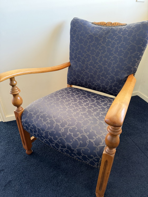 Discover this classic vintage set of armchairs, beautifully reupholstered to enhance any living space. The intricate woodwork and elegant fabric pattern bring timeless charm and sophistication.