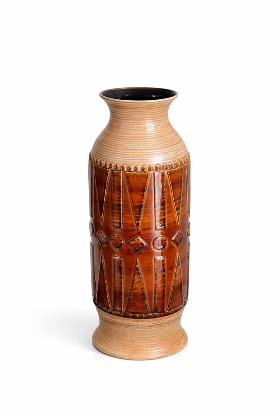 This exquisite Klein Keramik floor vase, model 723-52, is a quintessential example of Mid-Century Modern design from West Germany, circa 1970. Its elegant form and intricate detailing make it a striking addition to any sophisticated interior. The vase's rich, earthy tones and textured surface evoke a sense of timeless elegance, perfect for enhancing a living room or study with a touch of vintage charm.