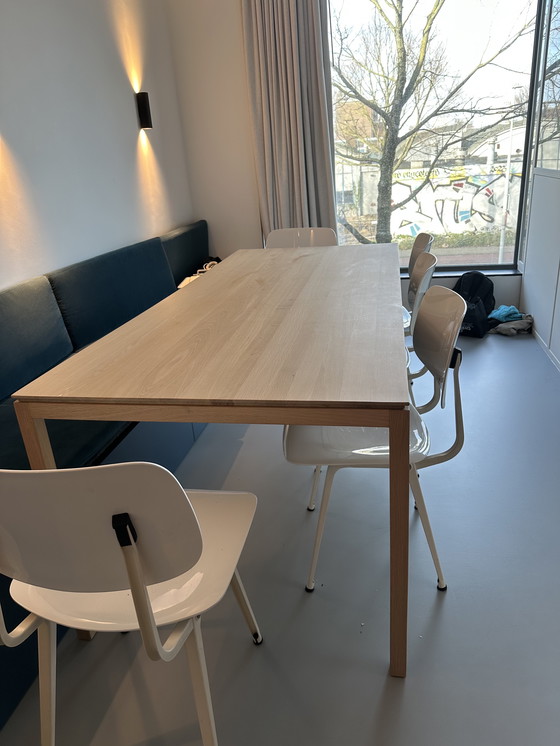 Kluskens Mistral Dining Table, measuring 200x90cm. Crafted from high-quality oak, this table features a clear lacquered finish that beautifully showcases the natural wood grain, adding a sophisticated touch to any dining room.