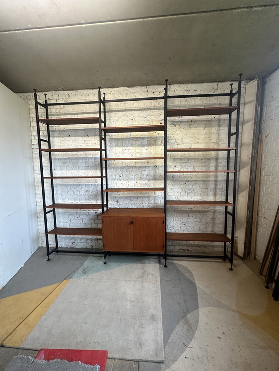 This is a classic Knoll International wall unit from 1960, a paragon of timeless Mid - Century Modern design. Made of a combination of wood and metal, it offers a sturdy and stylish storage solution. The furniture features multiple shelves and a central cabinet, ideal for organizing books, decor or other items. Embellished with beautiful new leather handles, this furniture is both functional and elegant, making it a perfect addition to any living space.