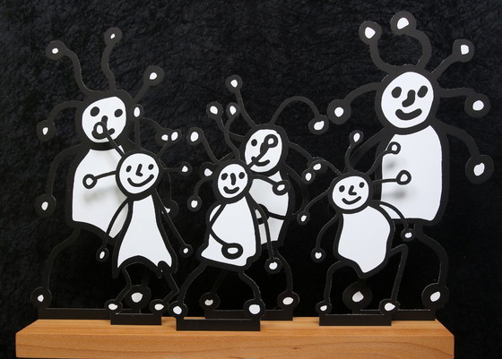 This piece "SPRKL Family" is an installation with 6 SPRKL figures made of 3 mm aluminum composite on a solid beechwood base. The figures can be individually positioned within the base.