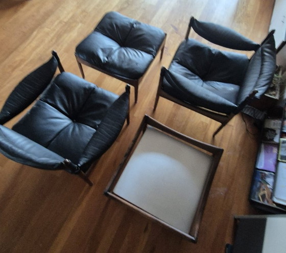 Iconic four-piece seating set in black leather and rosewood: two armchairs, an ottoman, and a low table from the legendary Modus series. Designed in 1963 by the renowned Danish designer Kristian Vedel for Søren Willadsen. The sling-like, sculpted backrests and armrests conform perfectly to the body; a rare Scandinavian modern masterpiece with rosewood frames and leather cushions, even spotted in François Truffaut’s Fahrenheit 451 (1966).
