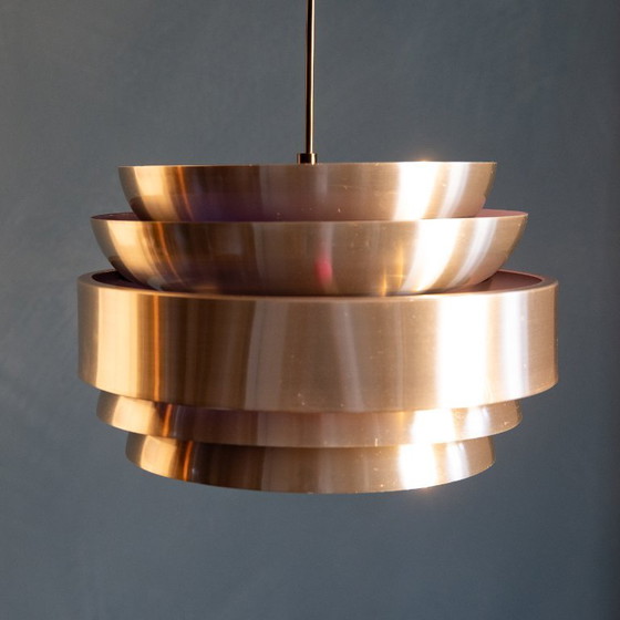 Beautiful metal pendant lamp from the Dutch brand Lakro Amstelveen, with a design strongly reminiscent of Carl Thore's iconic Trava lamp. The lamp consists of several metal discs elegantly stacked on top of each other. The insides are purple, which creates a warm and atmospheric light effect when switched on.