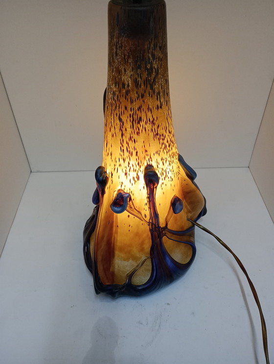 This beautiful table lamp by Michele Luzoro is a masterpiece of glass paste, creating a warm and inviting atmosphere in any room. Its unique design, with its flowing lines and rich color palette of brown and blue, reflects the refined aesthetic of the Art Nouveau style.