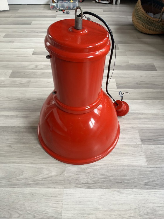 Industrial pendant lamp, designed by Italian designer Roberto Menghi for Fontana Arte in the 1970s. The lamp is height-adjustable. Made of durable metal. I have two lamps.
