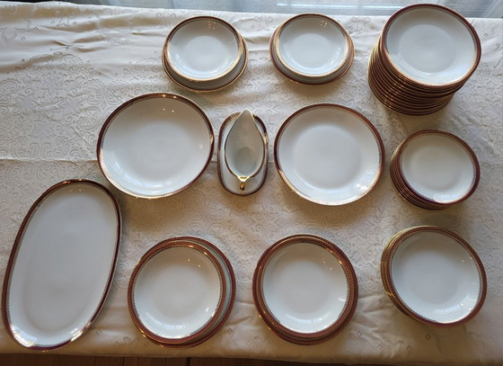 Discover the timeless elegance of the Larchevêque dinnerware set, crafted from Sologne porcelain in France. This 38-piece set is ideal for enhancing your meals with family and friends. Each piece is adorned with a delicate red and gold rim, adding a touch of sophistication to your table.