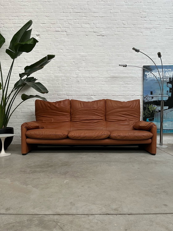 This is a large 3-seater Maralunga sofa by Cassina, re- upholstered in luxurious cognac aniline leather. The sofa features a modern design with adjustable backrests for added comfort. Its rich warm cognac color and sleek lines make it a stylish addition to any living space. The high-quality but soft and supple natural organic leather has a beautiful patina and provides a comfortable seating experience. Perfect for those who appreciate high-quality craftsmanship and timeless design.