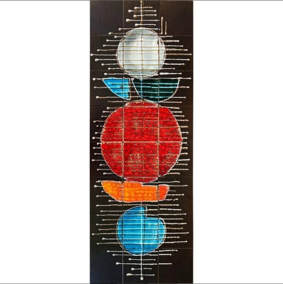 A typical ceramic artwork of the period, in the style of Juliette Belarti's creations. Origin: Vallauris, France, but no artist's signature. I like the idea of being able to hang it horizontally or vertically. Dimensions: 123 cm x 46 cm. Ready to hang. Excellent condition with only minor signs of age. The delicate chrome-plated metal frame shows some signs of wear here and there, but nothing significant.