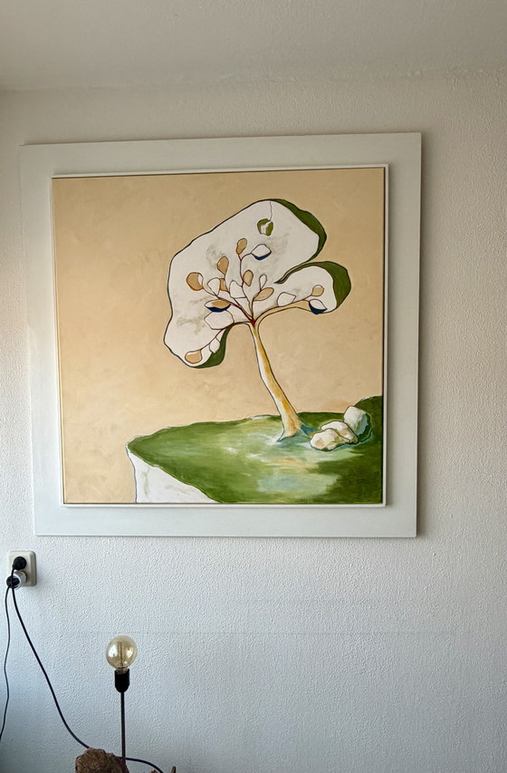 The work is characterized by her recognizable organic visual language: a stylized tree on a soft green raised platform against a warm, ochre-yellow background. Thanks to the flowing lines and dreamy use of color, it is a true eye-catcher that comes into its own in both modern and classic interiors.