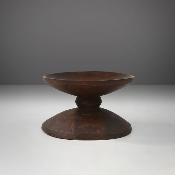 1950 / African Tree Trunk Bowl / Mid-Century / Vintage / Design Eye-catching large African oak bowl in diabolo form, crafted around 1950. Hand made from a solid tree trunk, this bowl is one-of-a-kind with its own distinct characteristics and natural beauty. The rich wood grain and organic shape of the piece bring a touch of nature indoors, creating a warm and inviting atmosphere in your interior.