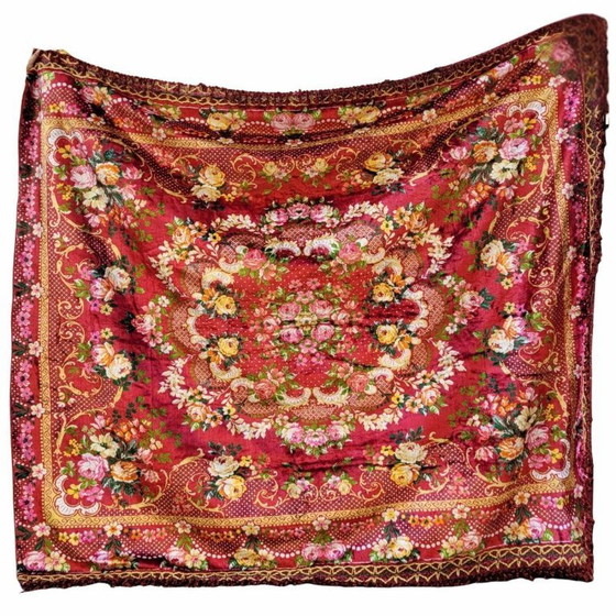 Large bedspread/tapestry, floral print, 40's - Eastern Europe Material: silk velvet Period: 1940s Origin: Eastern Europe Good condition according to its age and use Dimensions: 230 x 190 cm. / Fringes 6 cm. Exceptional decorative bedspread from Eastern Europe or Turkey, dated around the 1940s. This piece stands out for its exquisite craftsmanship and its strong symbolic charge, a direct inheritance of the rich textile tradition of oriental influence. It exhibits a complex floral design made in a luxurious silk velvet fabric. This velvet, of intense red color, acts as a background for the profuse floral composition, dominated by a central medallion of symmetrical and elegant design. Around it are arranged floral motifs that surround it in the form of petals, predominating in warm tones such as reds, ochres, pinks and greens. In Turkish culture, heavily influenced by Eastern art, flowers are not merely ornamental but symbolize a wide variety of virtues, such as prosperity, beauty, and spirituality. The design is completed with a vegetal and geometric frame, a kind of garland, and on the outside of the quilt, a fringed border frames the piece. This decorative detail not only adds movement but also brings a sophisticated finish to the piece. Beyond its textile function, this quilt is a true cultural testament to its time and geography. The patterns that adorn it are inspired by natural elements, ancestral beliefs, and symbolic narratives, characteristic of the decorative art of Eastern Europe and the southern Mediterranean. Its completely handcrafted construction involves the highest technical skill and the use of fine materials, ensuring its beauty and durability to this day. Shipping of the product will be paid by the buyer according to the dimensions, weight, and destination. We will contact you to arrange the arrangement and agree on a quote. Custom-made professional packaging is included in the shipping costs. and personalized shipping, with tracking number and warranty. The buyer will be responsible for paying import duties and associated taxes in the destination country, if applicable. Please note the seller's disclaimer regarding possible customs charges, as they are levied in the destination country and the amount due is determined by that country's customs office.