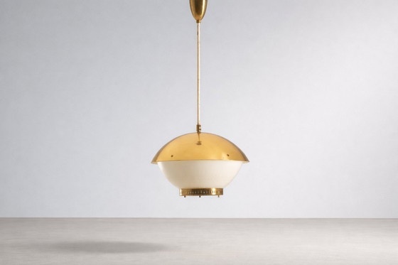 This large vintage pendant light features a refined combination of brass and engraved opaline glass. Its balanced hemispherical form and warm materials reflect European lighting design of the mid-20th century, emphasizing elegance, functionality, and soft ambient illumination.