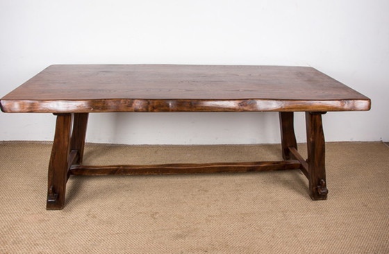 Stunning Scandinavian-style dining table. Entirely handmade, like a farmhouse table, this elegantly rustic table comfortably seats eight. A large central stretcher and side stretchers held by tenons provide excellent stability. Clean design, beautifully crafted.