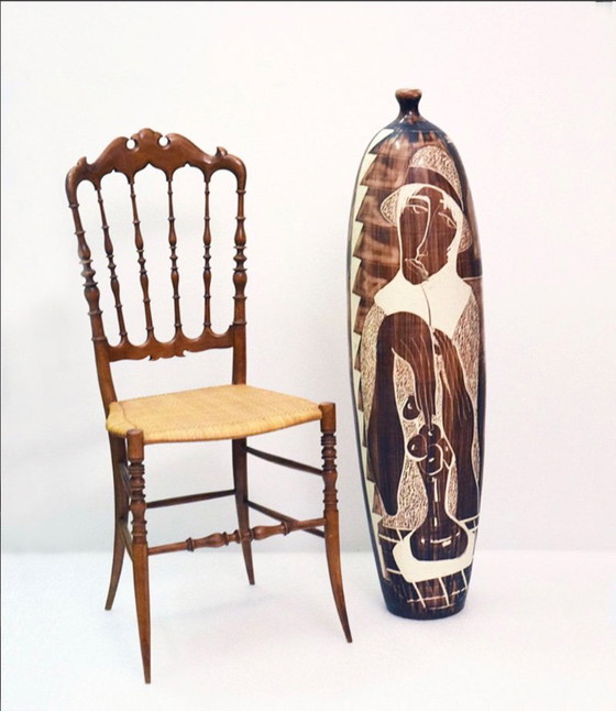 Large ceramic vase with engraved decoration, Ceramiche di Faenza, 1970s. Large ceramic vase featuring an engraved depiction of a woman’s face in shades of brown and white, produced by Ceramiche di Faenza in the 1970s. Double signature on the base. One-of-a-kind piece. In excellent condition.