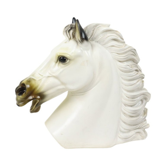 Beautiful large bust of a horse; the sculpture is made of solid plaster and hand-painted, dating from the second half of the 20th century, maker unknown.