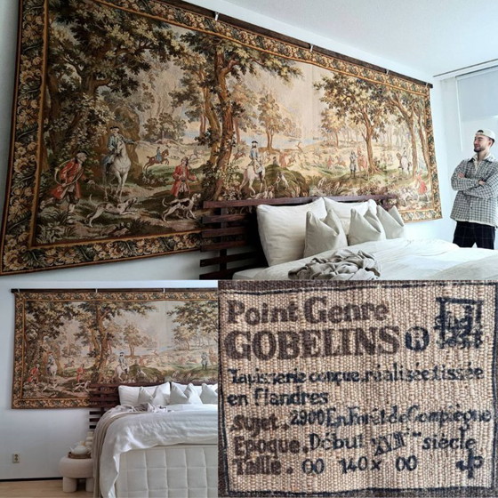 Since I am currently pursuing my Master's degree in Delft, it now hangs on a wall in my studio in Delft, as you can see in the photos. I have now slid a simple 4-meter beam through the fabric tunnel on the back to hang it, but I am offering only the carpet itself. I need the wall space in this studio to hang the many wall decorations I make and design for clients, so after much deliberation, I decided to find a new owner for it who can hang the carpet in a prestigious spot where it can be admired in all its glory. So, to be clear: Although machine-woven (and hand-finished), this is not like most other machine-woven vintage French tapestries you often encounter online (many of which lack atelier labels and belong to more standard, cheaper productions or are even completely fake), but a high-quality custom-made piece with both original labels from Jules Pansu, a renowned French atelier in the top segment, known for producing museum-worthy works using the refined Point d’Halluin jacquard technique, with a very high thread count and hand-finished, a process that requires a high level of craftsmanship and precision. Please bid according to value.