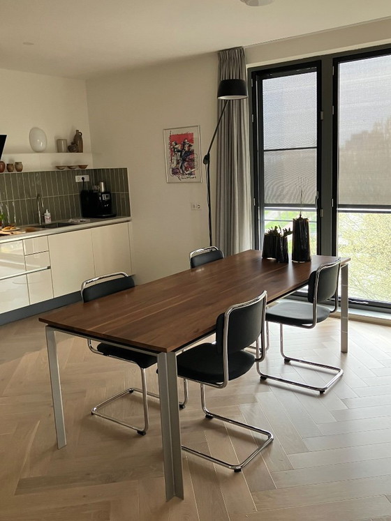 For sale: heavy designer dining table measuring 90x220 cm. The top is solid walnut, and the base is powder-coated steel. Top quality. The table is used but in very good condition. Can be picked up in Zoetermeer. The table can be collected when our new table is delivered.