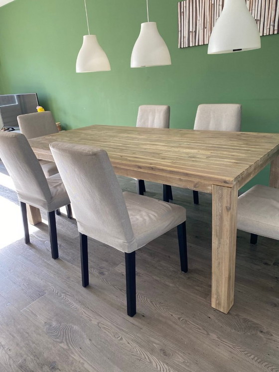 Beautiful large (extendable) 6-person acacia wood dining table with six chairs.