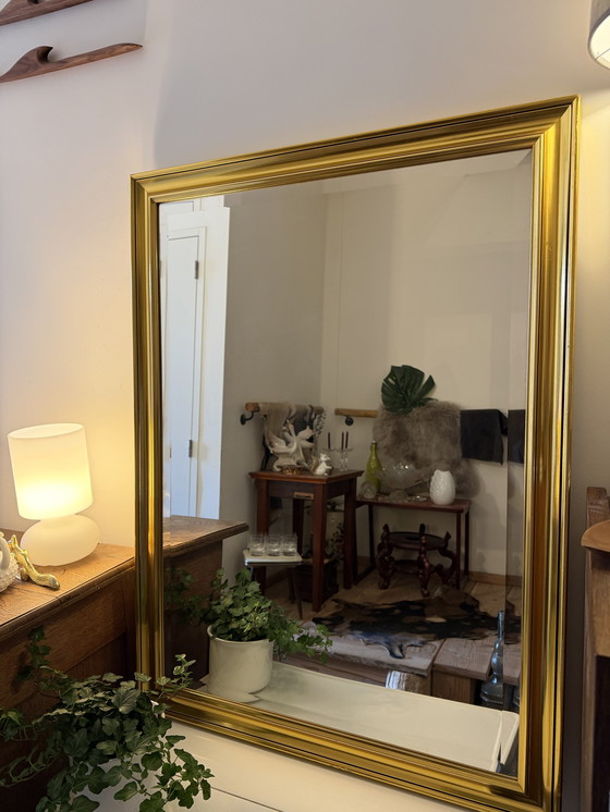 A beautiful, generous mirror with a wide gold-colored frame and sleek, beveled glass. The frame has a warm, brass-colored sheen. The glass is beautifully beveled. Its size makes it a real statement piece on the wall.