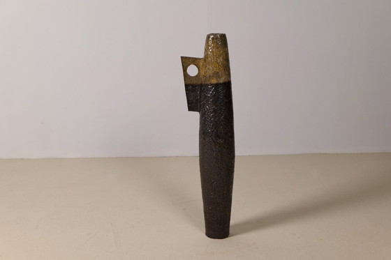 A rare and compelling French Modernist studio vase, likely made in the later part of the 20th century, with a striking architectural presence. This tall, slender form features a sharply angular ear with a pierced hole, echoing Brutalist and abstract sculptural traditions. Handmade in coarse raw stoneware, glazed in a earth-toned glaze.