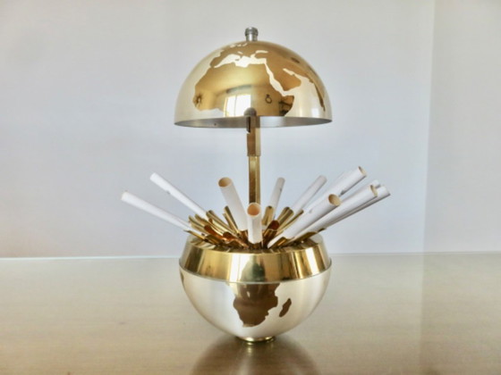 Large brass globe with a dispenser for 25 cigarettes. German model of very high quality. It has never been used; the dummy cigarettes are still inside. Height 14cm. Diameter 13cm. Minor marks on the globe and two very small, barely visible dents. A beautiful decorative object.
