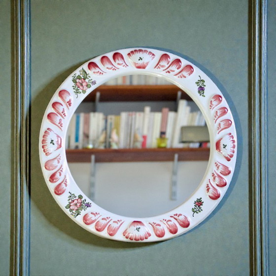 Unique piece. Large round handcrafted ceramic mirror from Moustiers, signed Dellerie, handmade and hand-painted.