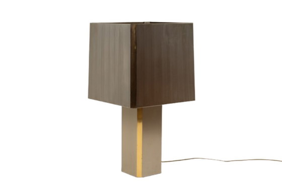 Large cube-shaped lamp with a brushed metal base and shade, accented with gilded brass corners.