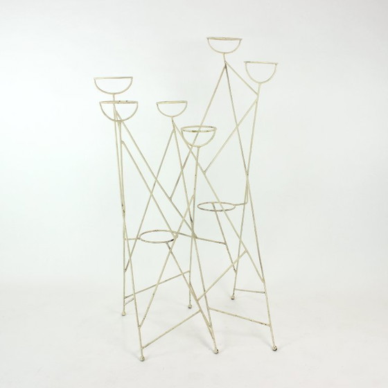 A striking blend of mid-century design and industrial charm, this plant holder originates from Czechoslovakia and dates to the 1960s. Constructed from steel rods, the stand accommodates up to eight plant pots set within circular rings. The structure is strong and well balanced, while the surface shows authentic age patina, with areas of original paint loss revealing the piece’s layered history. Deeply rooted in the 1960s tradition of indoor greenery, this sculptural stand feels especially relevant today—an ideal statement piece for the modern plant lover.