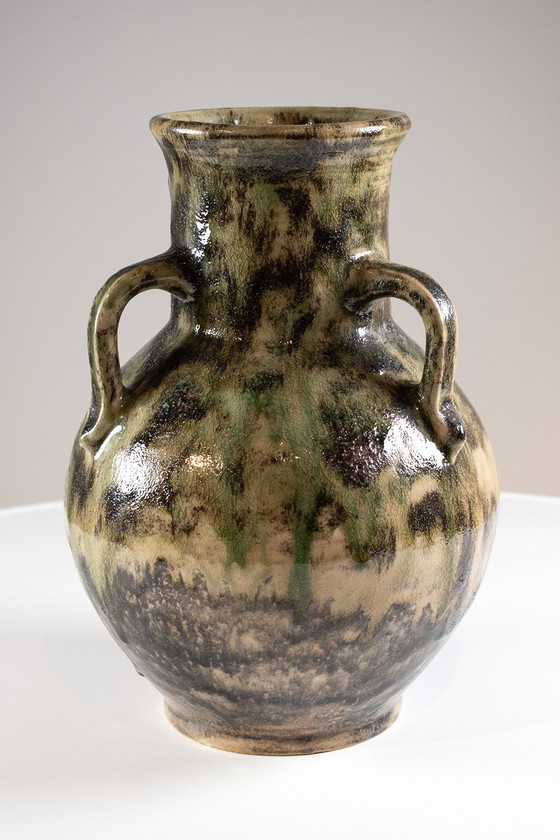 Large vase with three handles, beautifully glazed in earth tones and moss green, marked "J.H. van Riessen." In good vintage condition.