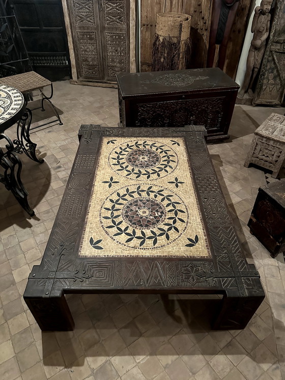 Superb handcrafted coffee table featuring intricate mosaic inlays in a symmetrical floral pattern. The solid wood frame is richly carved with geometric and botanical motifs, giving it an elegant, antique-inspired look. Sturdy and unique, this table is a statement piece for any interior, blending rustic charm with artisanal craftsmanship.