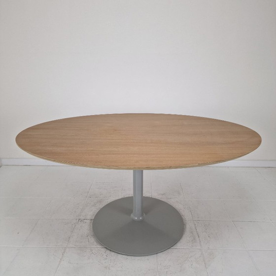 The table features a beautifully proportioned oval oak-veneered top resting on a very stable central pedestal base, offering both visual lightness and excellent functionality. The sculptural base bears the Artifort mark underneath, confirming authenticity.