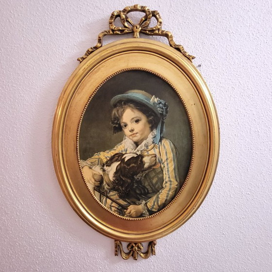 This oval, gold-toned frame, adorned with a delicate bow, embodies the timeless elegance of vintage style. Perfect for showcasing a portrait, it adds a touch of sophistication to any interior.