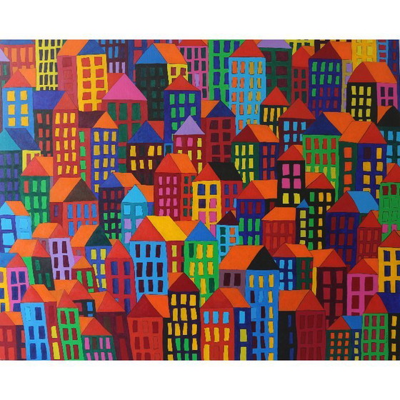 This impressive painting, titled 'Home Too', is a colorful explosion of urban architecture. Created around 2009, it captures the vibrant energy of a city in an abstract style. The bright colors and geometric shapes make it a striking piece that can brighten up any space.