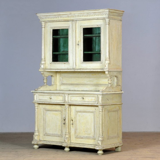 A large pine sideboard from around 1900, in its original paint. The sideboard consists of two separate sections. The top section has two doors, behind which are two spacious shelves, ideal for tableware or decorative items. The base features two drawers and two doors with an additional shelf, providing ample practical storage space. The sideboard has a particularly beautiful, weathered patina that emphasizes its authentic character. A charming and characterful piece that fits perfectly in both a rustic and eclectic interior, instantly adding warmth and history to any space.