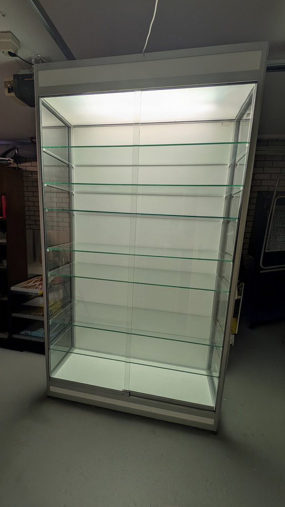 Beautiful and spacious display case for sale, perfect for stores, collections or exhibitions! Specifications: - Made of sturdy glass with a white back - Features sliding glass doors - 7 adjustable glass shelves, ideal for different layouts - Light box at the top for optimal illumination of your products or items The cabinet is in clean condition and exudes professionalism. Dimensions: 220 cm high x 120 cm wide and 40 cm deep. Serious bids only.