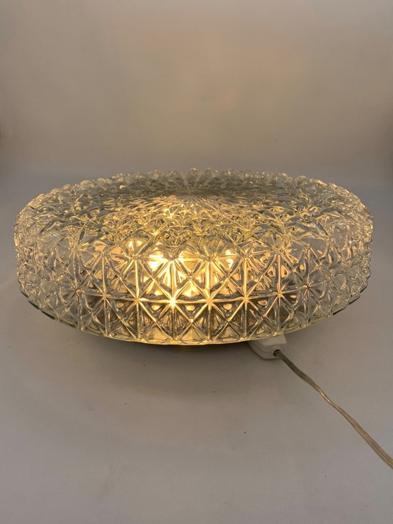 Single ceiling or wall light in clear glass with a refined star-shaped geometric motif, typical of 1960s and 1970s design. Its faceted surface creates evocative plays of light and reflections, diffusing a warm, enveloping glow. Its low, circular shape lends it an elegant and discreet look, ideal both as an accent light and as a decorative element. Perfect for vintage, modern, or mid-century spaces, it adds character and atmosphere.