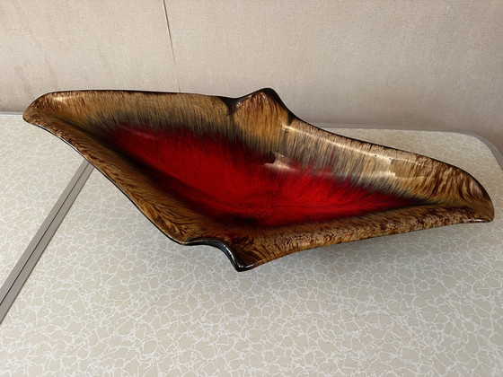This vintage ceramic bowl, attributed to Vallauris, showcases a striking red and brown glaze. Its unique shape and vibrant colors make it a standout decorative piece, perfect for adding a touch of retro charm to any space. Ideal as a centerpiece or a stylish catch-all.