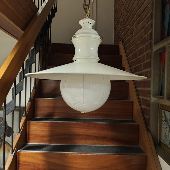This striking European pendant lamp dates from approximately the 1970s and features a wide white enamel shade combined with a large opaline glass diffuser. The result is a soft, atmospheric light with strong visual presence.