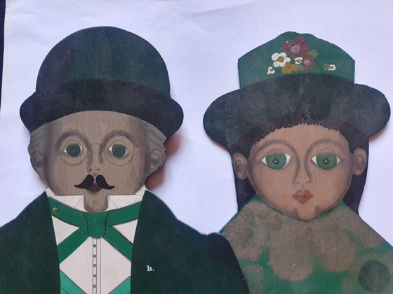 For sale is this charming duo from the mid-1970s. These two XL jumping jacks impress with their detailed, nostalgic design and their considerable size of approximately 49 cm. Width: male 36 cm; female 29 cm; depth approximately 0.8 cm at the points where the arms and body meet, approximately 0.4 cm on the body alone.