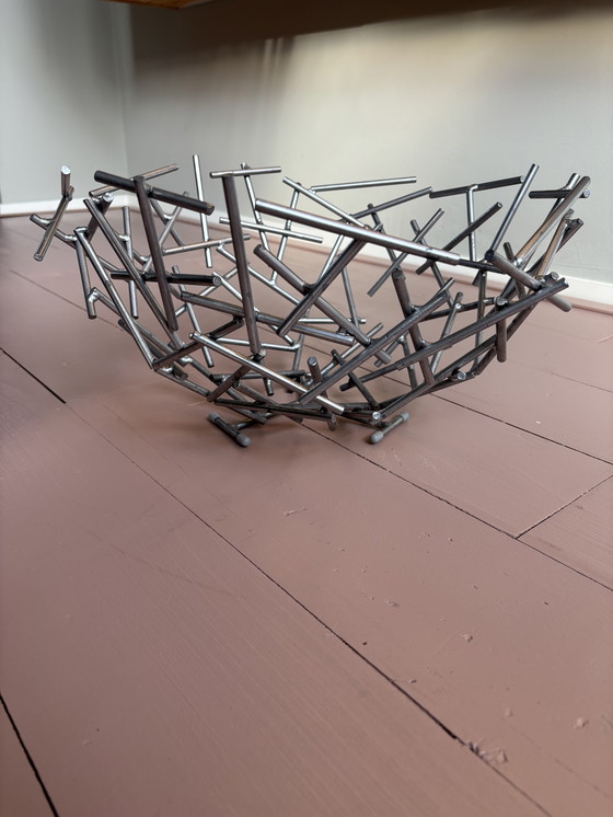 Large, vintage fruit bowl made of matte silver metal. Made of pieces of metal welded together, in the style of the Alessi Blow up fruit bowl....
