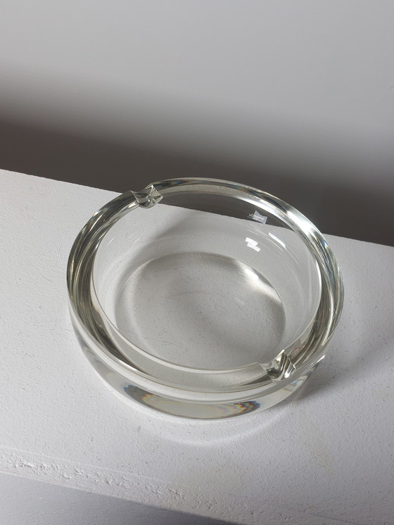 This stunning vintage crystal glass cigar ashtray embodies the elegance of Mid-Century Modern design. Its clean, transparent form lends a timeless aesthetic to any room, making it a perfect collector's item for lovers of classic design.