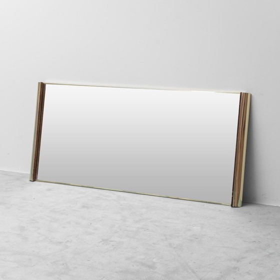 Step back in time with this exquisite large vintage mirror, a true emblem of 1970s modern design. The mirror's expansive surface is elegantly framed with a luxurious combination of brass and suede, offering a sophisticated touch to any room. Its golden hue, complemented by the rich brown suede, creates a warm and inviting ambiance, perfect for enhancing both contemporary and classic interiors.